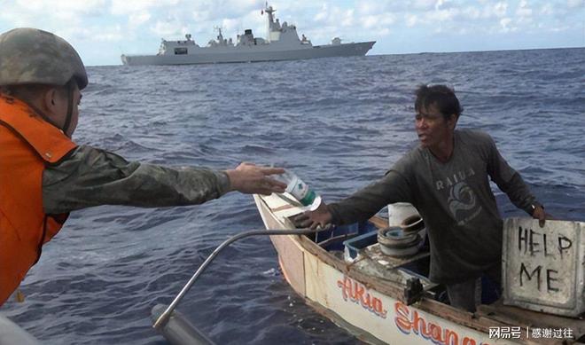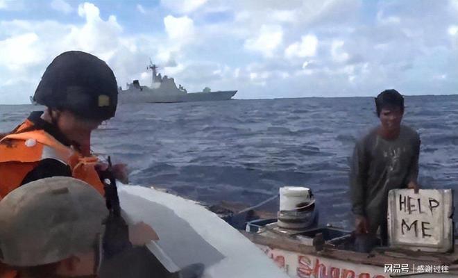 而就在两天后,中国合肥舰在南海巡航时发现一艘菲律宾渔船遇险,渔民高举“HelpMe”木牌,中方立刻展开救援,提供饮水、饼干和医疗救助,并与菲海警船顺利交接。
